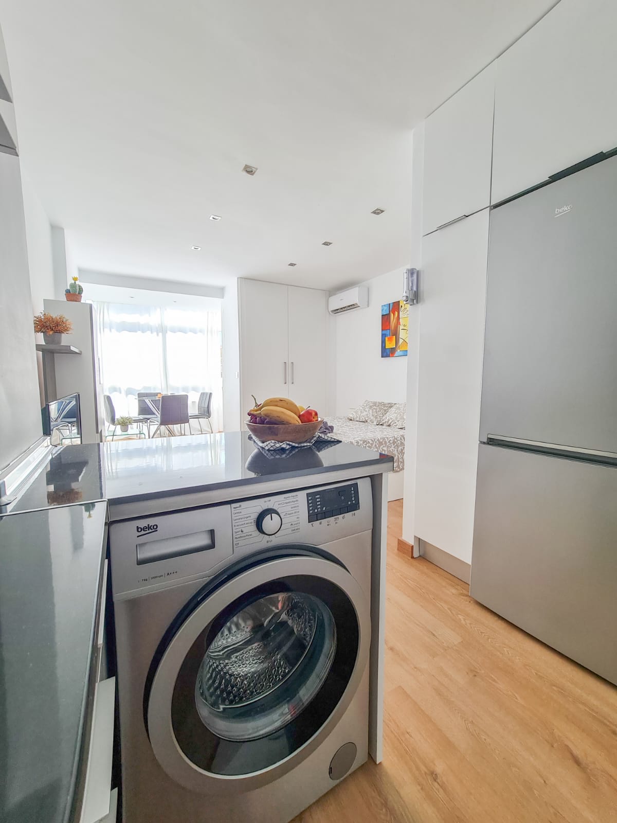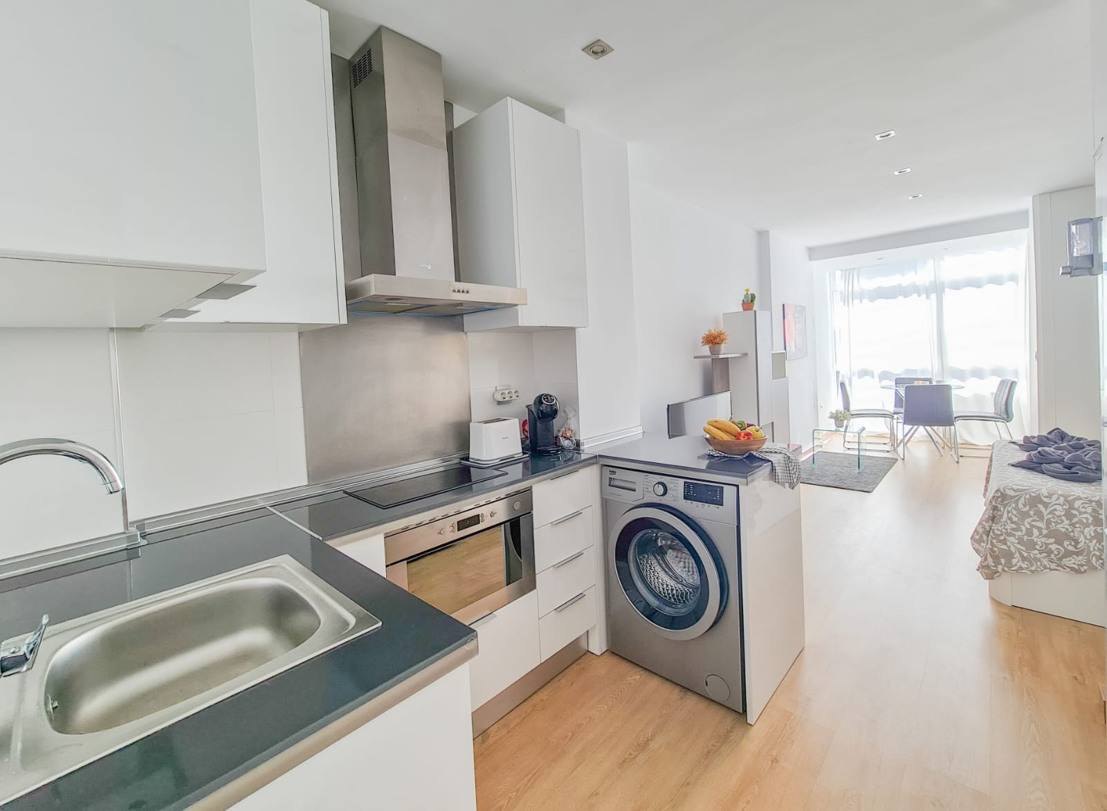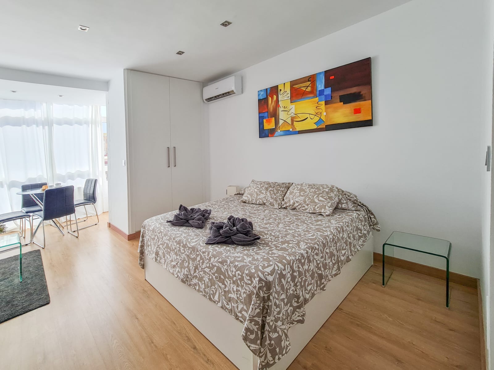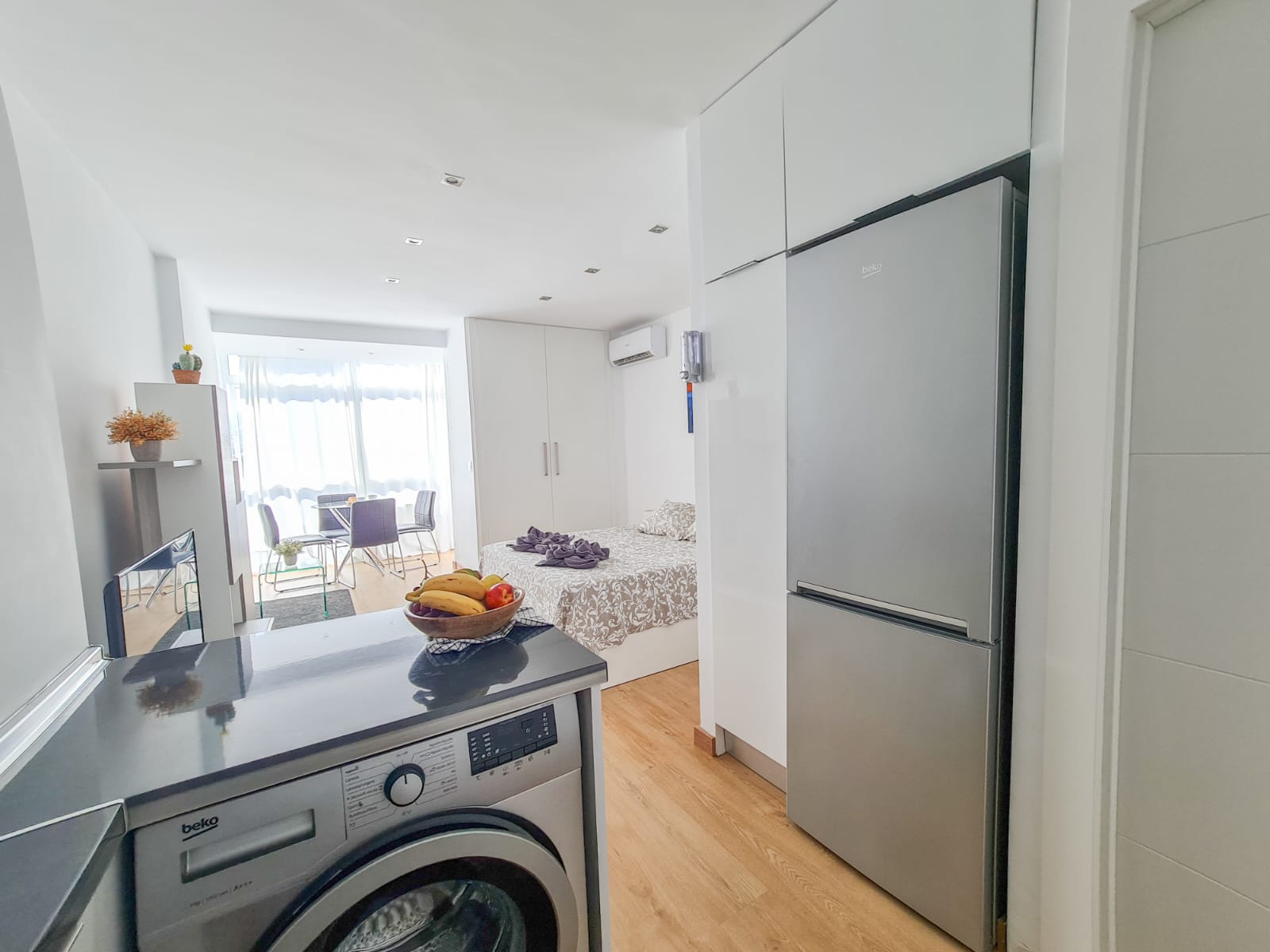 Estudio de 30m2 con cama doble, posee balcón cerrado con agradables vistas. Espacio de cocina integrada y baño. Recepción las 24 horas, cuenta con piscinas y parques.